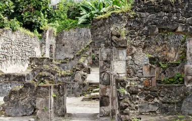 Lors de l’éruption de la montagne Pelée en 1902, la ville de Saint-Pierre a été détruite et l’on peut désormais visiter ses ruines. Saint-Pierre semble être suspendue dans le temps et l’on peut ainsi grimper les marches de l’ancien théâtre de Saint-Pierre, arpenter les couloirs de l’ancienne prison, contempler les vestiges noircis par le volcan de l’église du fort de Saint-Pierre… Un voyage des plus dépaysants. En toile de fond, la montagne Pelée se dresse face aux vestiges de la ville.